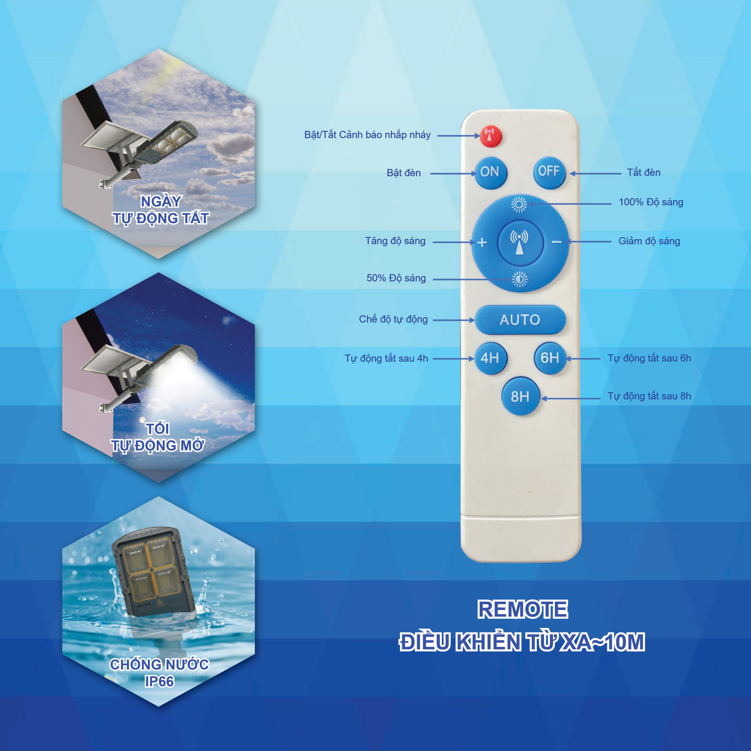 - Chiếu sáng: Tự động bật khi trời tối, chiếu sáng liên tục >12 giờ.
